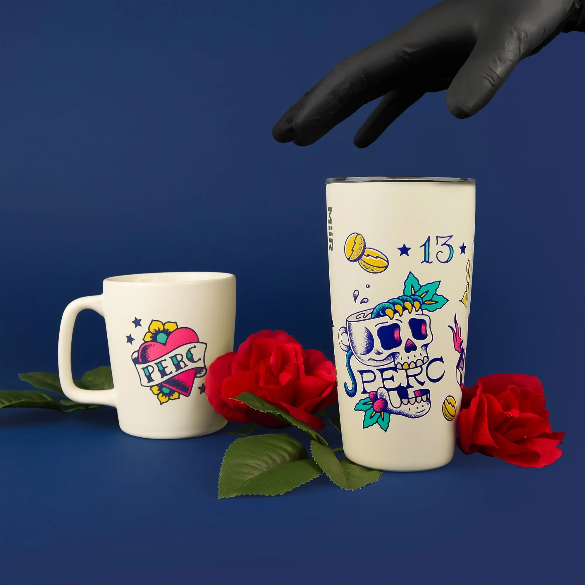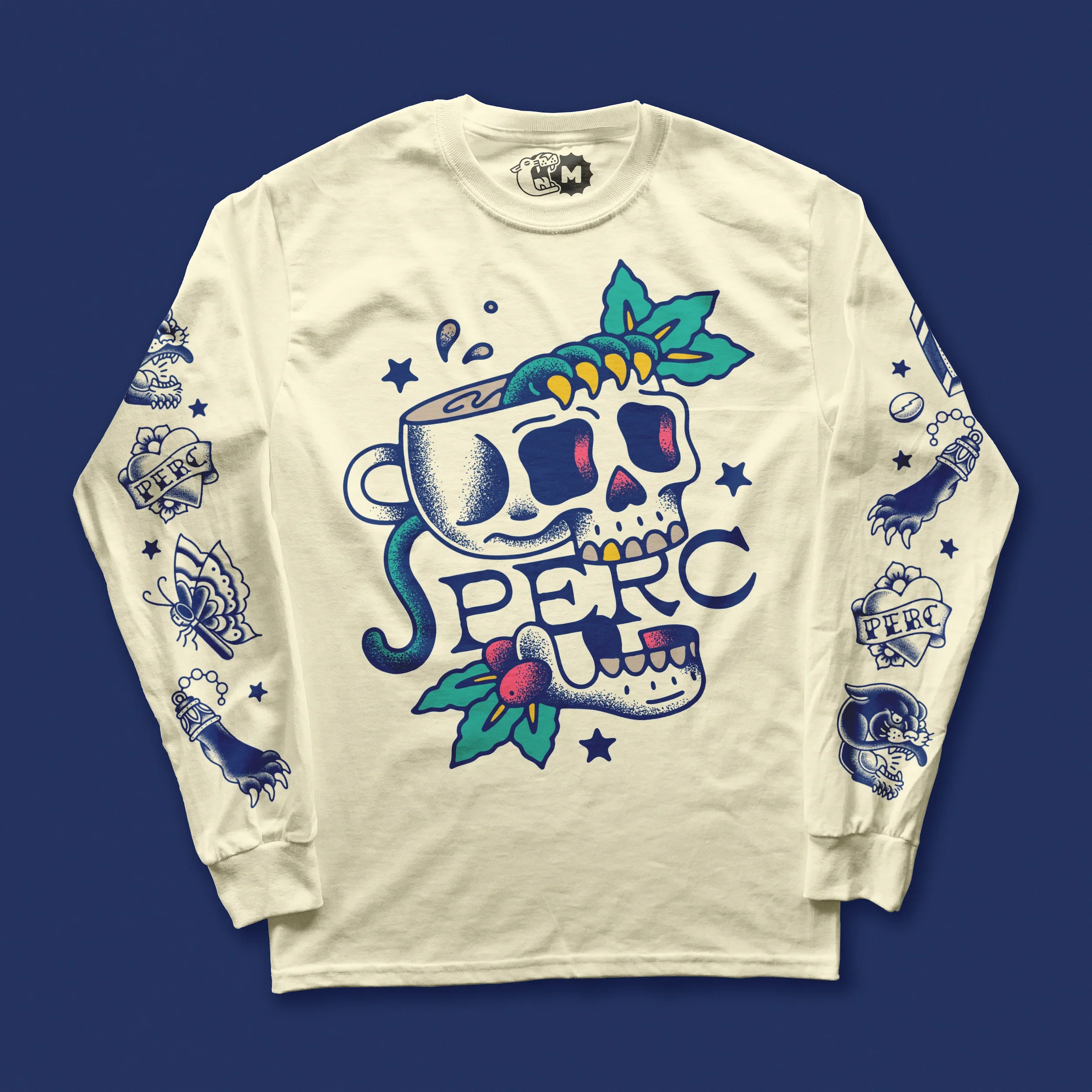 For this project, we pulled inspiration from American Traditional styling and added some PERC vibes. Drawing flash is second nature to me, and being able to PERC-ify it just made it that much more exciting. Being able to create all the flash and see it cover a range of products was so fulfilling to see.